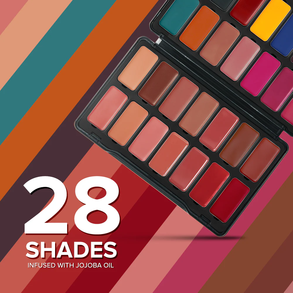 Unleash your inner artist with the Showstopper 28-Color Lip Palette—your ultimate tool for limitless creativity. Featuring 28 versatile shades, this palette is perfect for crafting custom looks, whether as lipstick, blush, or eyeshadow. Each shade delivers a velvety matte finish that stays flawless for up to 12 hours. Infused with nourishing jojoba seed oil and carnauba wax, the formula glides on effortlessly, keeping your skin hydrated and smooth. Dermatologically tested for safe use, this palette empowers you to explore endless combinations and take your beauty game to the next level.